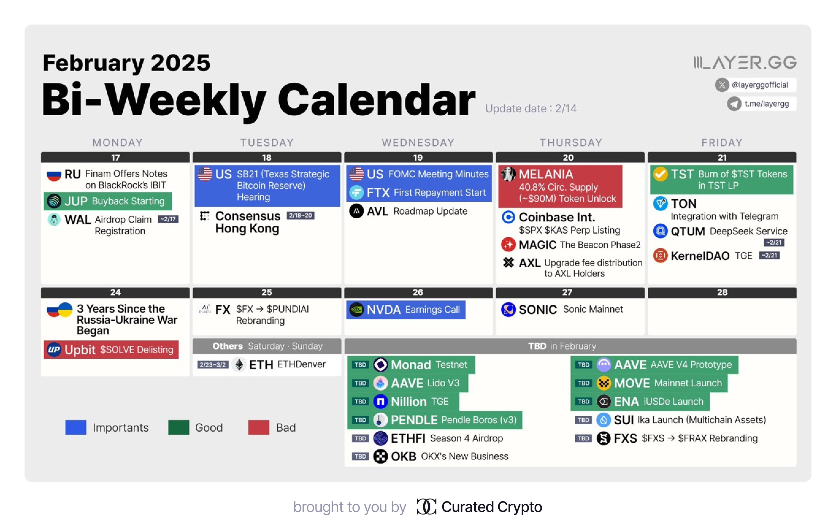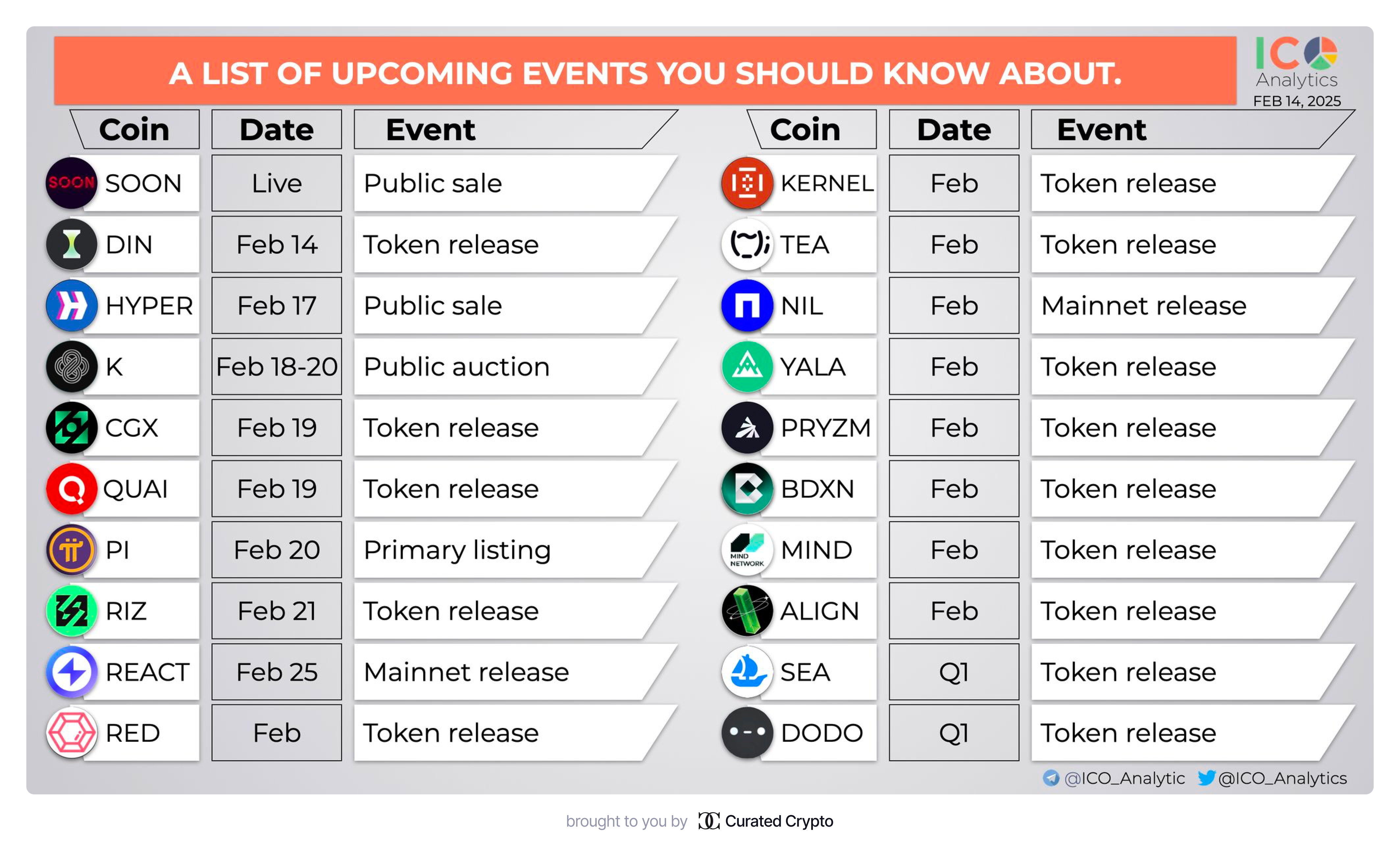 Key Upcoming Token Releases: $CGX (Feb 19), $RIZ (Feb 21), and $TEA, $YALA, $RED, $KERNEL, $BDXN, $ALIGN (all in February).