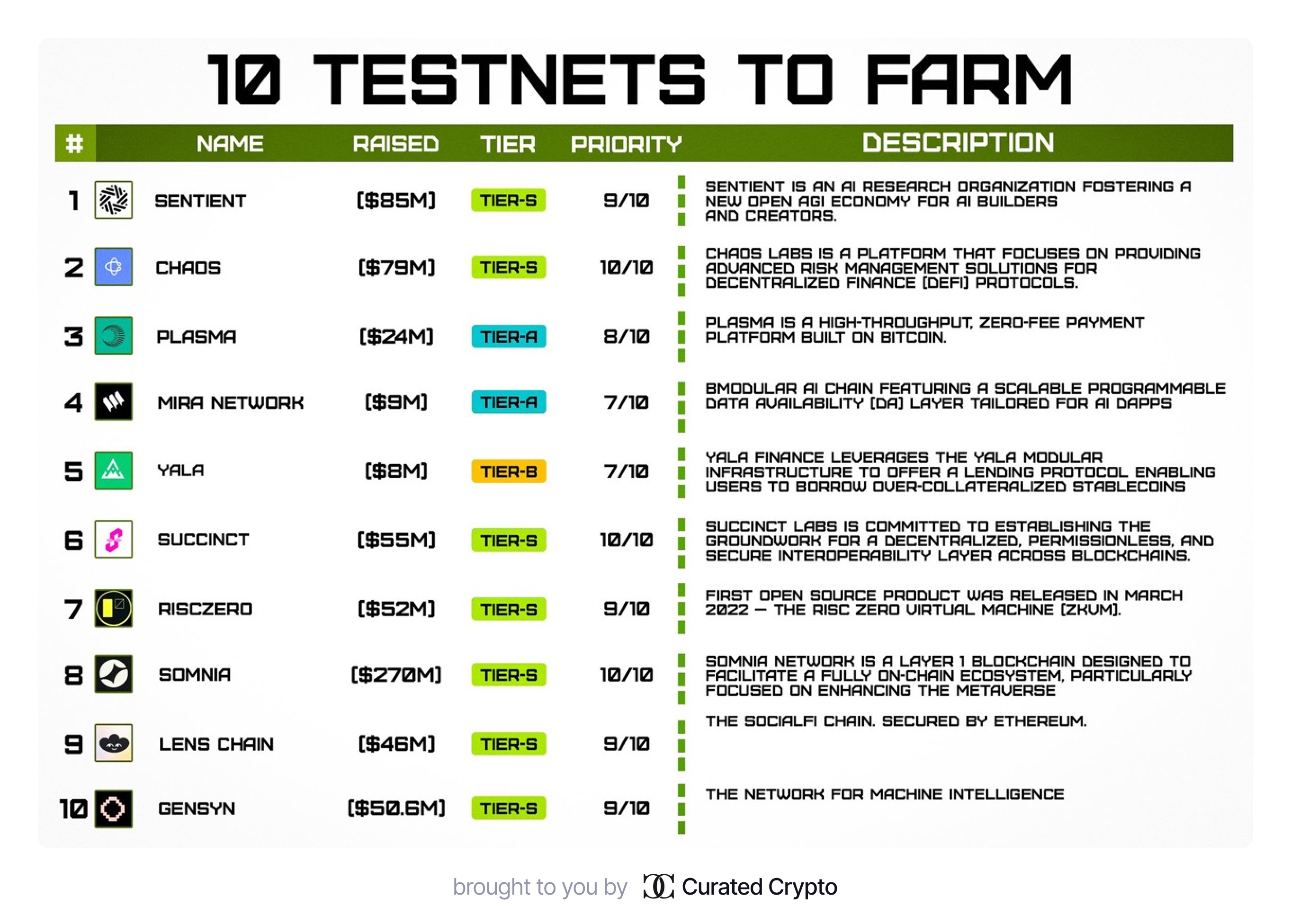 New Airdrops: the most promising testnets include Sentient, Chaos Labs, Plasma, Mira, and Yala, each offering innovative blockchain and cryptocurrency solutions and having received significant funding.
