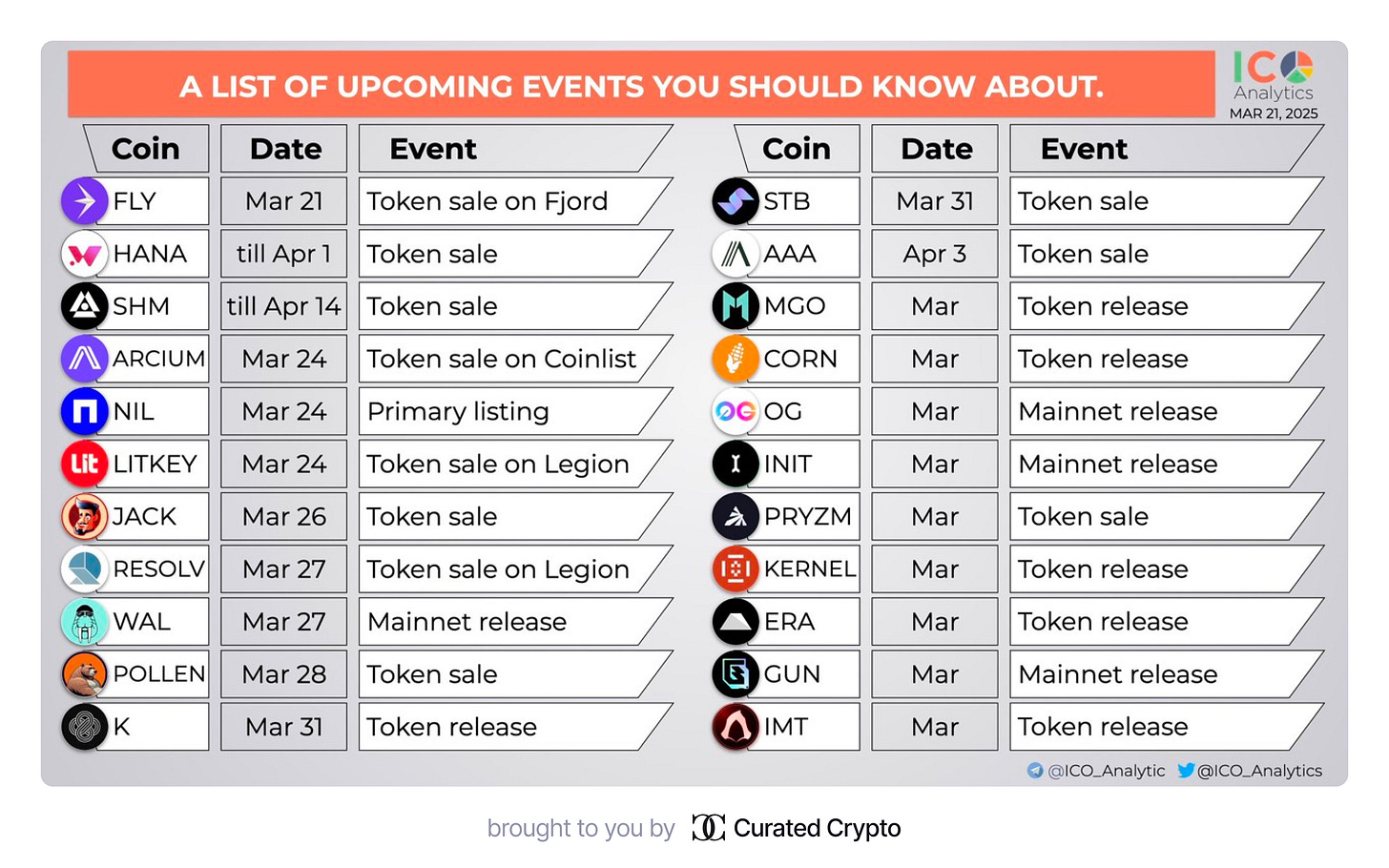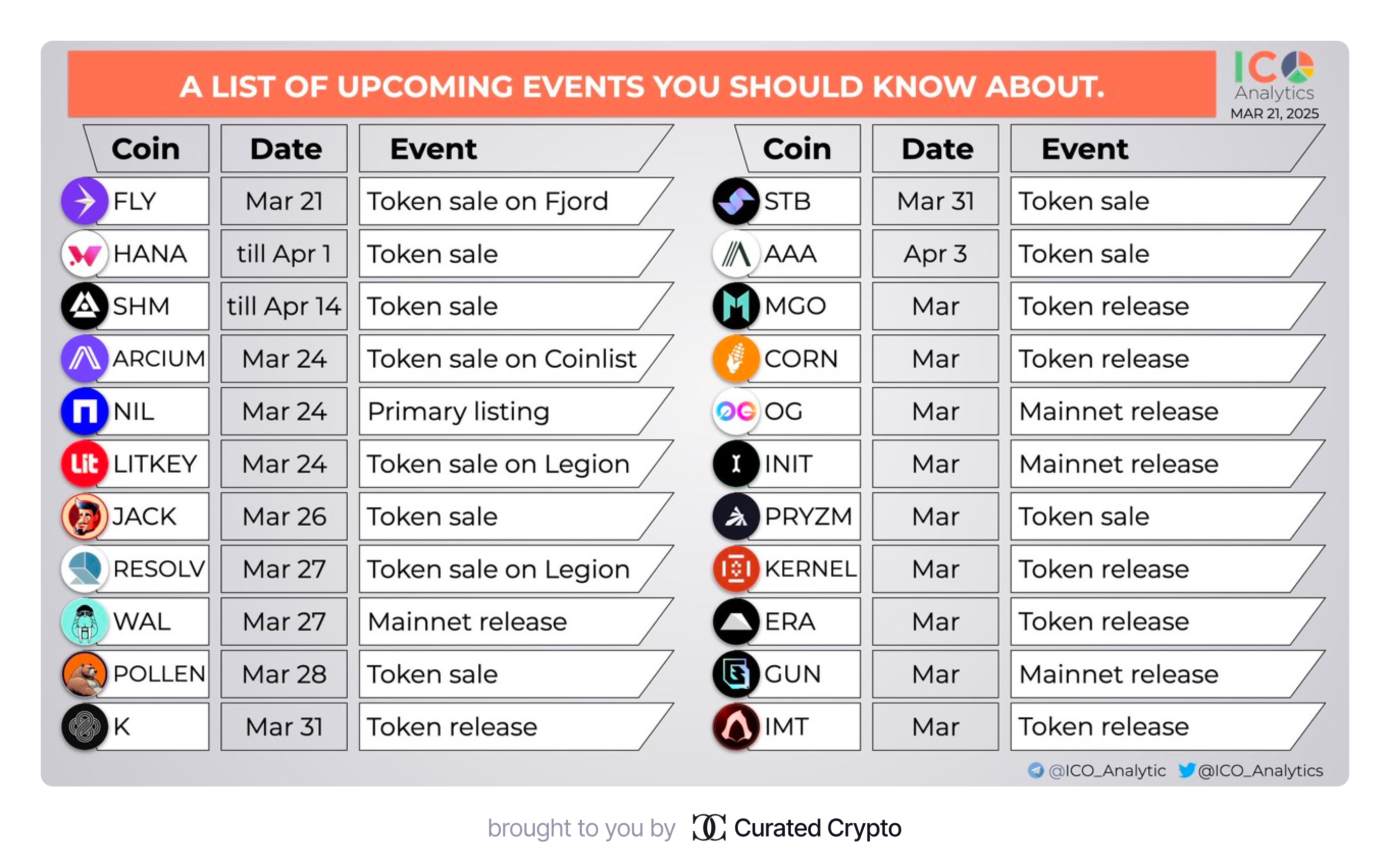 Upcoming TGEs and Token Sales: $JACK (Mar 26), $RSLV, $POLLEN (Mar 28), $KERNEL, $STB (Mar 31), $AAA (Apr 3), and mainnets $OG, $INIT (March).