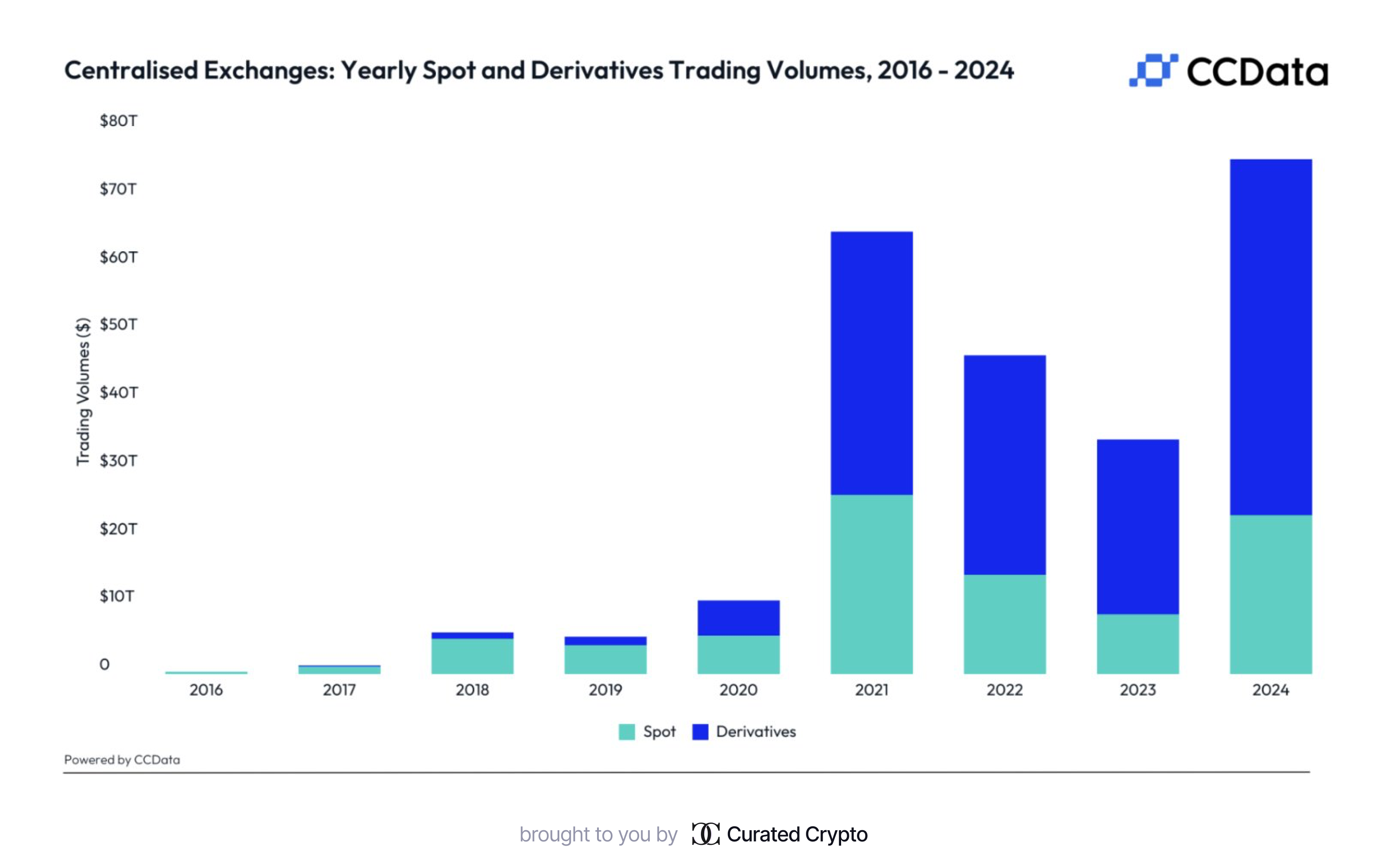 On centralized exchanges, 2024 saw a record-breaking $75.8T in annual trading volumes, surpassing the previous high of $65.1T set in 2021. Derivatives trading now accounts for 69.2% of total volumes, up significantly from 59.5% in 2021. December alone recorded $7.58T in monthly derivatives trading, marking the third consecutive month of growth.