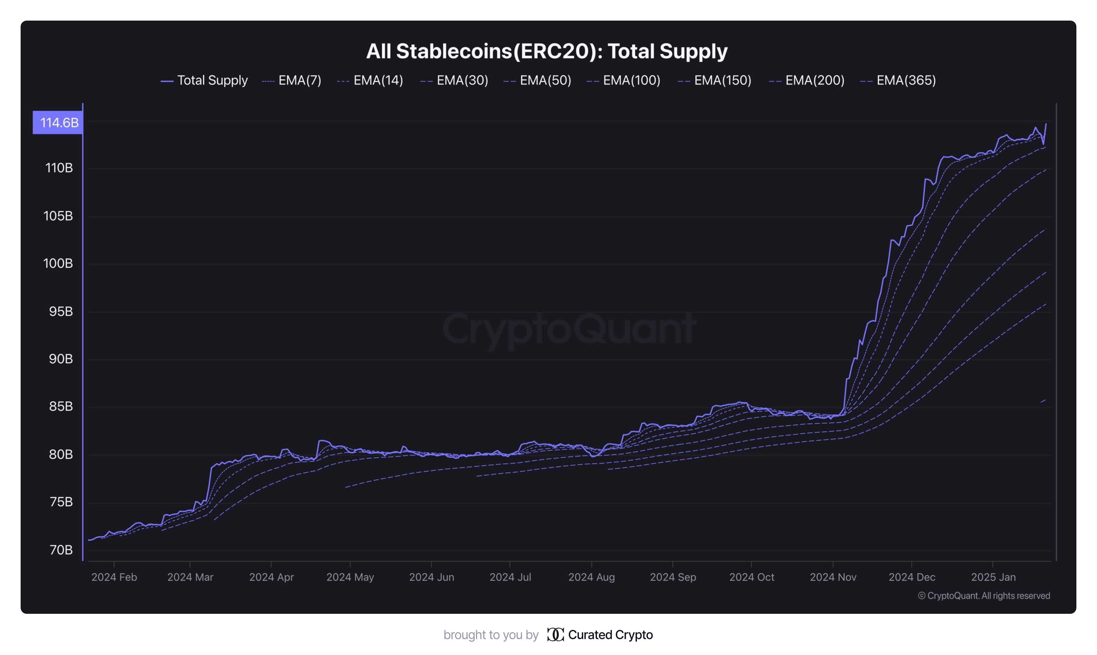 The total ERC20 stablecoin supply reached an all-time high of $114.6B, continuing its rapid growth since November 2024. This surge is partly attributed to increased market activity following Donald Trump’s inauguration. Investors appear to be converting fiat into stablecoins as a signal of growing confidence and preparation for future market opportunities.