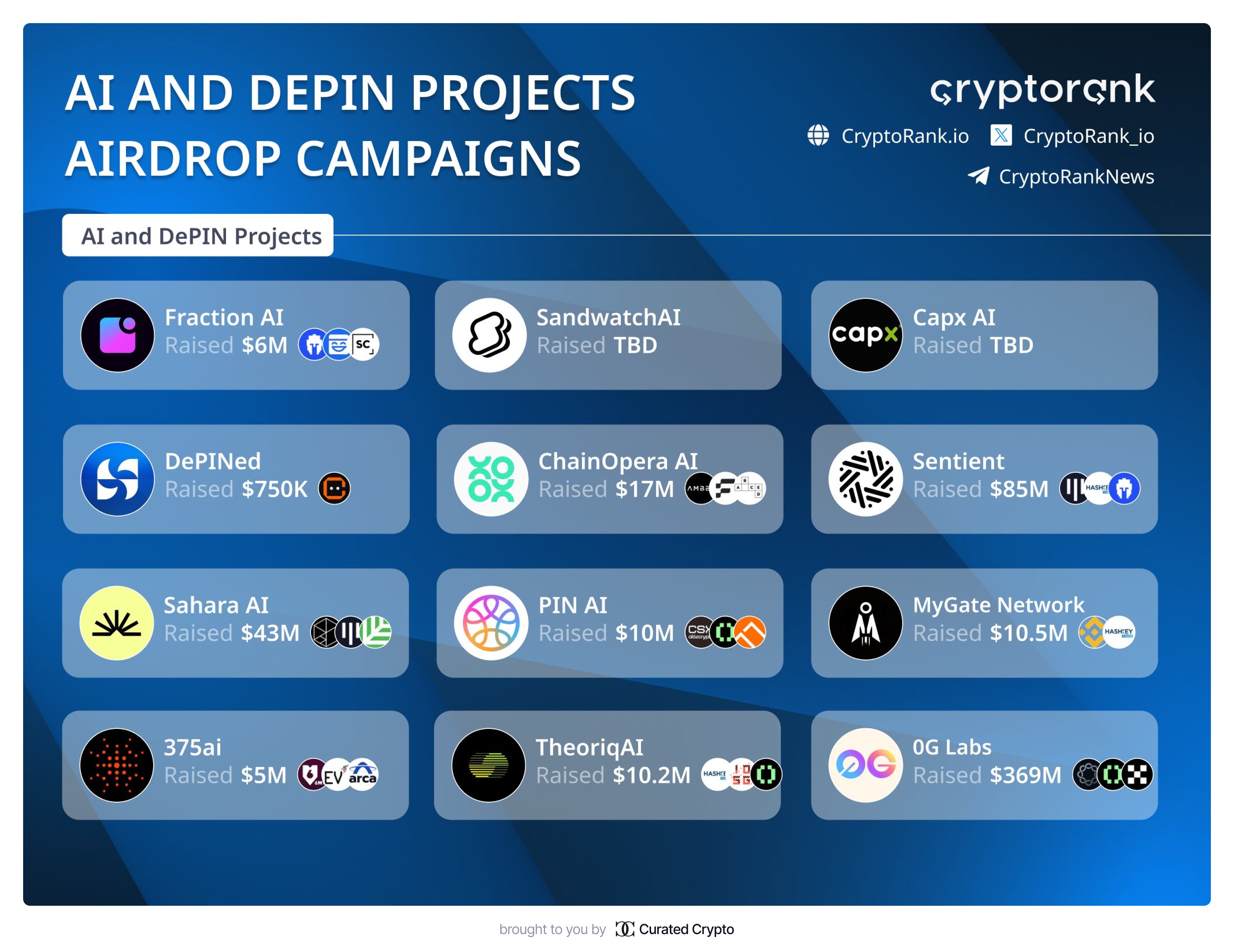 Explore promising AI and DePIN projects offering airdrop campaigns, ideal for those looking to earn tokens without major investments. Here's a snapshot of some noteworthy projects: