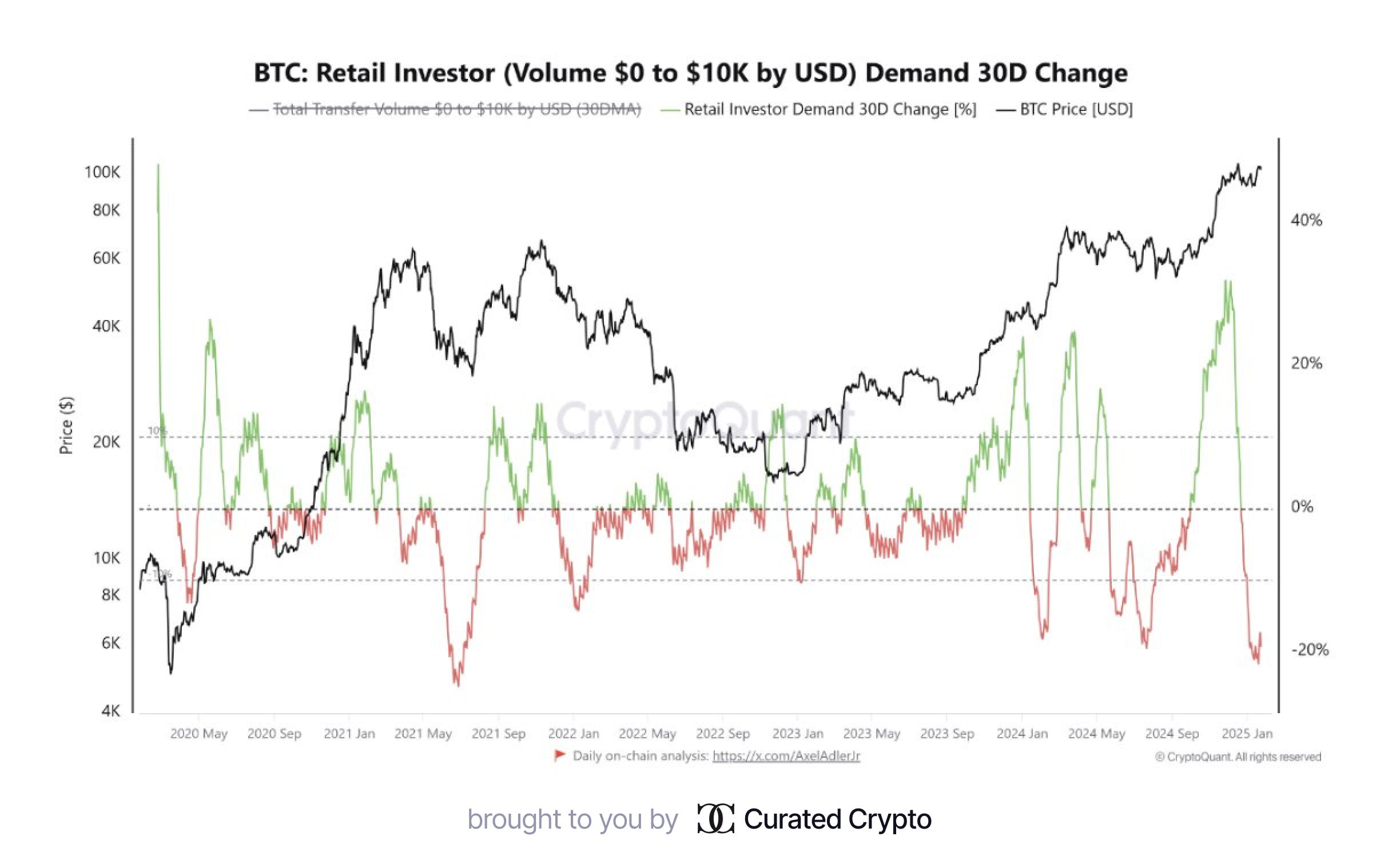 Historically, retail demand spikes during volatile periods, yet the current market is showing an atypical behavior. After a peak in December, retail activity began to taper off, reflecting a cautious sentiment likely driven by consolidation phases.